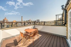 Bright and refined three-bedroom penthouse with private terrace, rooftop access with panoramic city views, and a sleek modern kitchen, all set within a distinguished period building in one of London’s most exclusive neighbourhoods