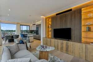This sophisticated apartment features expansive windows, a private balcony, and a sleek modern kitchen. Offering a luxurious yet personal lifestyle, it combines refined interiors with West London views, perfect for both relaxation and entertainment.
